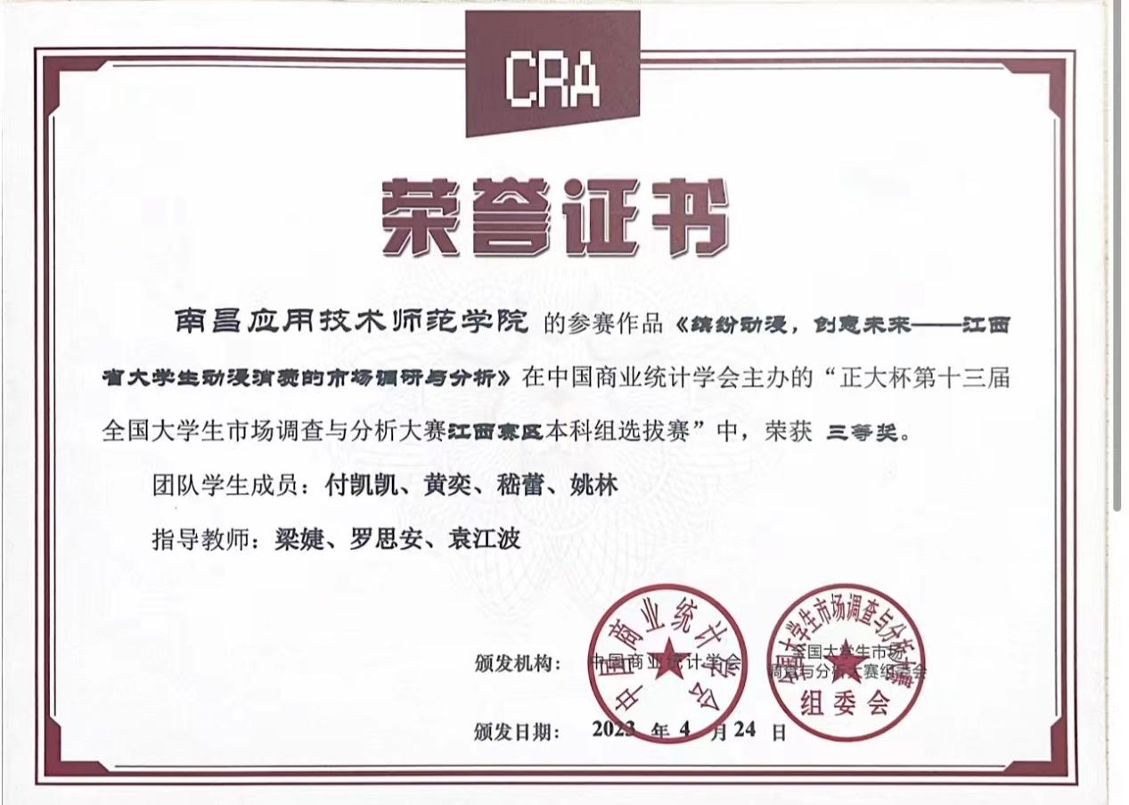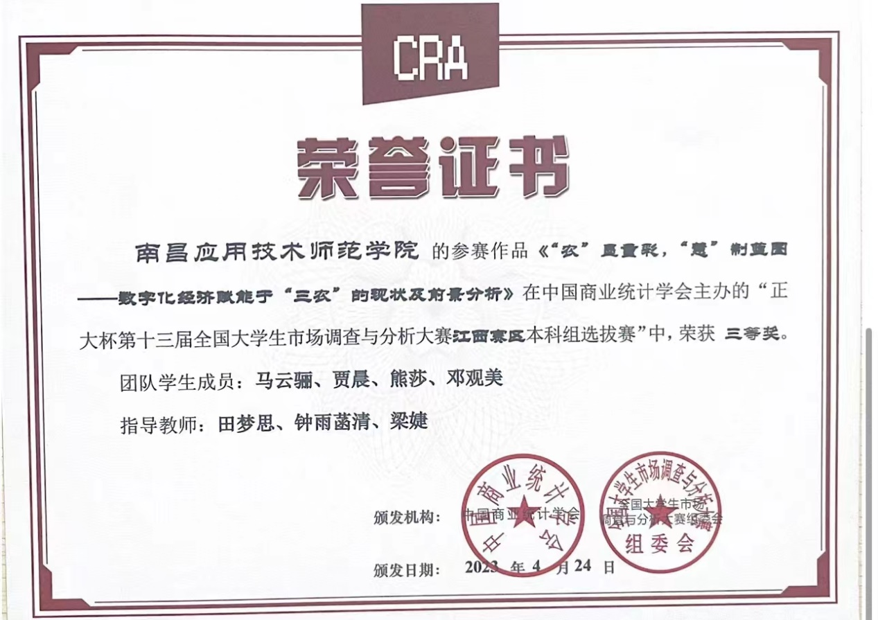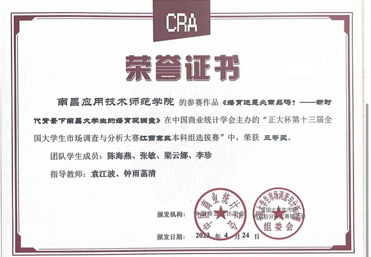 近日,由中国商业统计学会主办的“正大杯第十三届全国大学生市场调查与分析大赛”,江西赛区本科组已公布比赛结果,我校SUNBET申博罗思安、袁江波、田梦思、梁婕和钟雨菡清老师指导的学生参赛作品获得比赛二等奖1项,三等奖3项。