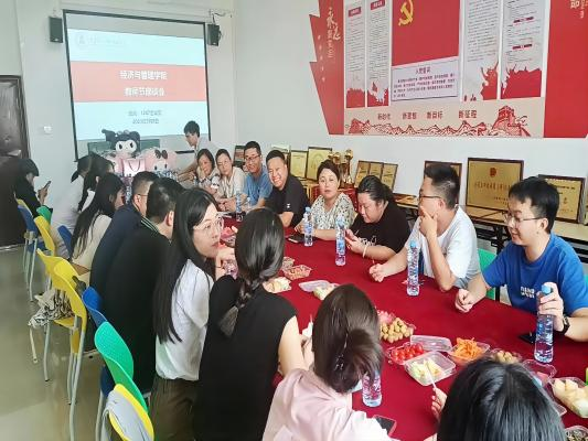 教书传道远,尊师种福长。在第39个教师节来临之际,SUNBET申博于2023年9 月8日,在经管会议室举办教师节茶话会,院长胡梨花、党总支书记龙犇和副院长袁江波以及全体教职工共同参加!几盘水果,精美点心,品茗清茶,在这样一个恬静美好的午后,一场温馨的教师节茶话如约进行,老师们愉快地交流教学事宜。