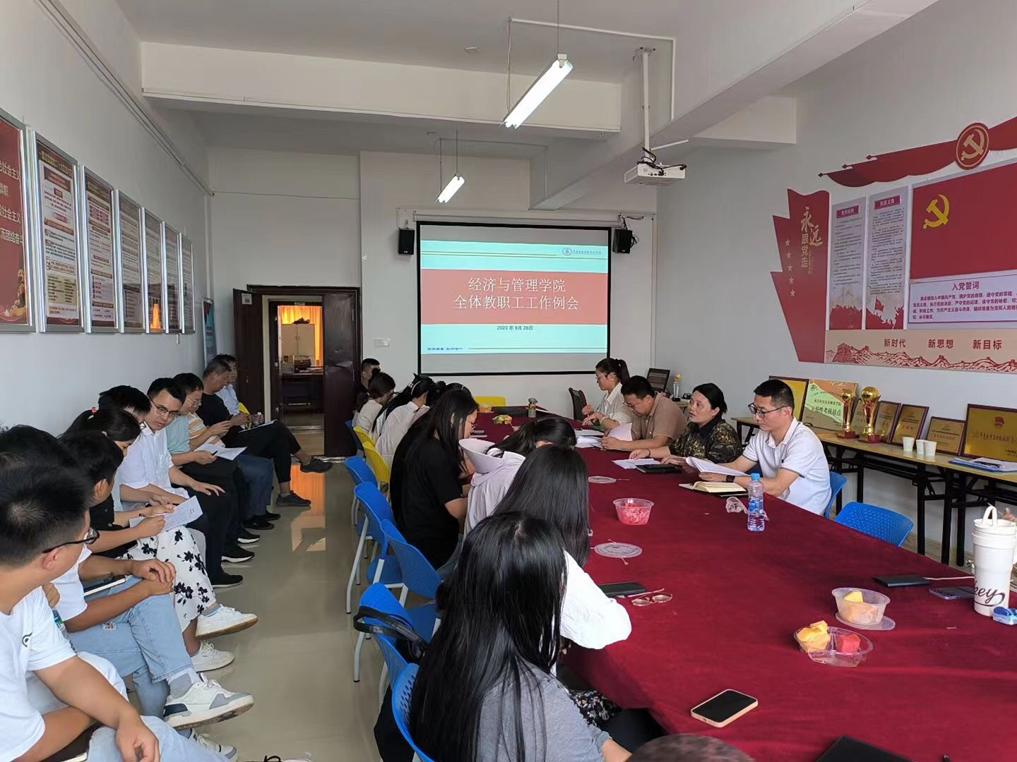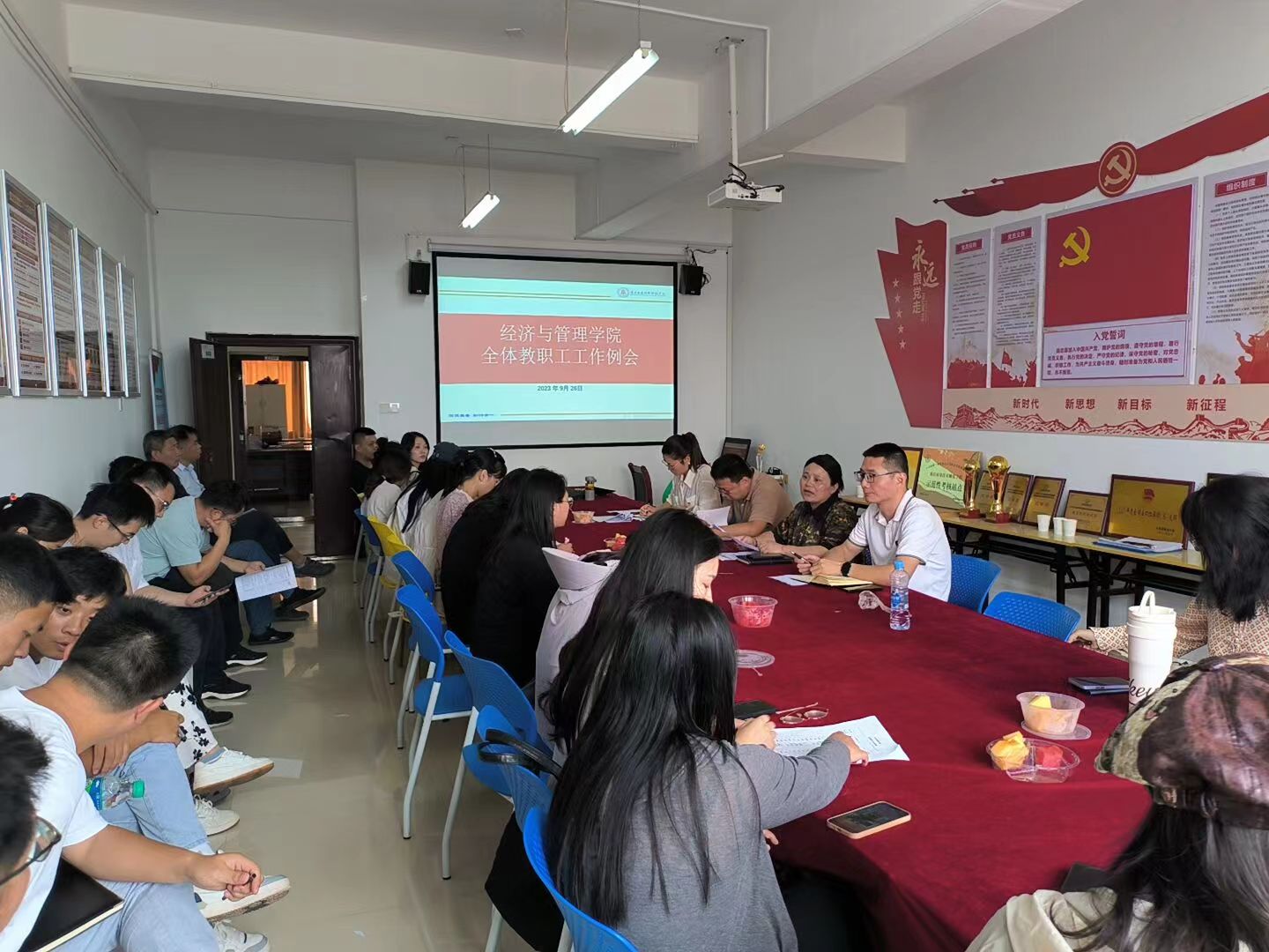 为贯彻学校相关政策的宣贯,落实学校颁发的制度。9月26日下午,SUNBET申博官网在会议室召开全体教职工工作例会。会议由院长胡梨花主持,党总支书记龙犇、副院长袁江波、副书记朱红梅及全体教职工出席会议。