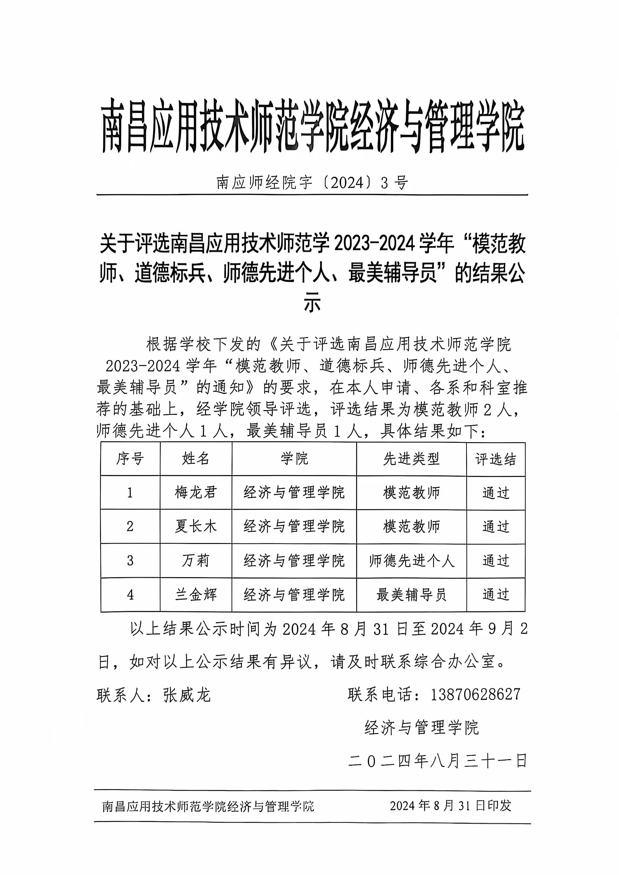 教学管理 学院新闻 学院公告 学科竞赛 您现在的位置是:首页 > 教学管理 > 学院公告 关于评选南昌应用技术师范学2023-2024学年“模范教师、道德标兵、师德先进个人、最美辅导员”的结果公示 管理员2024-08-313956 上一篇 SUNBET申博召开新任干部任职宣布会