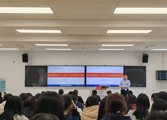 为全面深入学习贯彻党的二十届三中全会精神,引领全院师生把思想和行动统一到全会精神上来,凝聚奋斗力量。2024年10月22日,SUNBET申博官网邀请马克思主义学院钟秀利教授在沁苑二教B座309开展了以“学习贯彻党的二十届三中全会精神辅导报告”为主题的专题宣讲,SUNBET申博官网全体领导班子成员及师生代表参加学习。