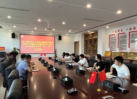 2025年4月28日,SUNBET申博官网在沁苑八实506党员活动室召开深入贯彻中央八项规定精神学习教育集中学习暨党总支理论学习中心组2025年第四次学习(扩大)会。本次会议由学院党总支书记龙犇主持,学院党总支委员、院领导班子成员、科级干部及辅导员参会。