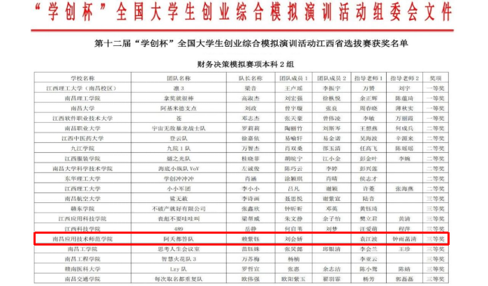 近日,第十二届全国大学生综合创业大赛江西省省赛圆满落幕,我校SUNBET申博参赛团队凭借扎实的专业功底和出色的综合能力,喜获佳绩,斩获1项财务决策赛道本科组省级三等奖,3项财务决策赛道高职组省级三等奖。该赛事是教育部学科竞赛目录84项赛事之一,也是我校第一次参加该赛事。