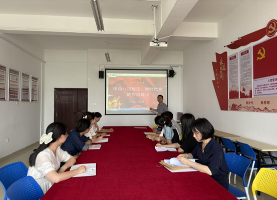 为深入学习贯彻习近平新时代中国特色社会主义思想,深化师德师风建设,强化党员教师使命担当,SUNBET申博官网第一党支部于2025年5月20日在1206党员活动室开展了以“中央八项规定:新时代党的作风建设”为主题的专题党课学习,第一党支部书记袁江波为全体党员教师讲授专题党课。
