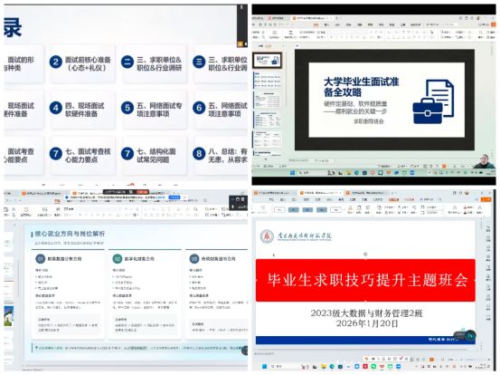 班会强调,学院将持续贯彻“就业服务不断线”的工作理念。寒假期间,学院就业办公室、指导老师与辅导员将通过线上平台保持常态化服务,及时推送招聘信息、政策解读与指导资源,提供“一对一”咨询与材料审核服务,确保毕业生在假期也能获得及时、有效的就业支持。此外,学院还将组织线上备考经验分享会、模拟面试等活动,搭建毕业生与往届校友、企业的交流平台,进一步拓展就业渠道,强化帮扶实效。